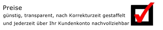 | | | Für Korrekturen ab dem 24-Stunden-Tarif gilt: KEINE FEHLER GEFUNDEN? KEINE KOSTEN! Das bedeutet: Wenn wir keinen Fehler in Ihrem Korrekturauftrag finden, zahlen Sie auch nichts. Dieses Versprechen gilt ausschließlich für Aufträge, deren Korrekturzeit einen Tag und länger ist.
